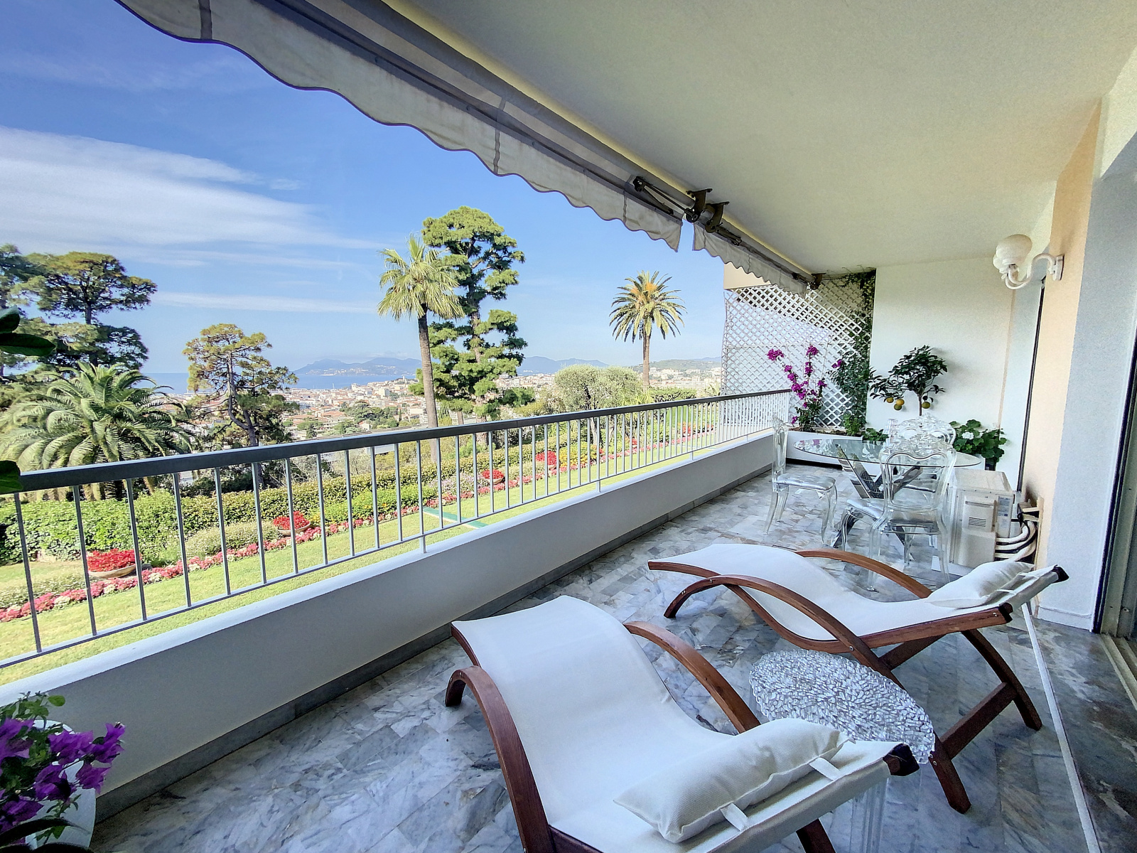 Cannes (06400)Spacieux 2 pièces de standing de 75 m² situé dans une petite résidence de standing, profonde terrasse plein sud, profitant d'une vue sur le parc prolongée d'une vue mer. Résidence gardiennée avec piscine, box fermé, au calme absolu.