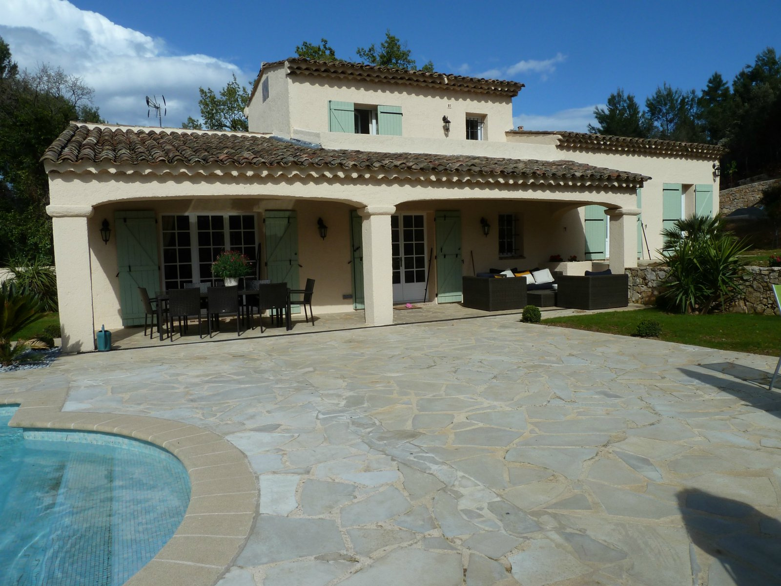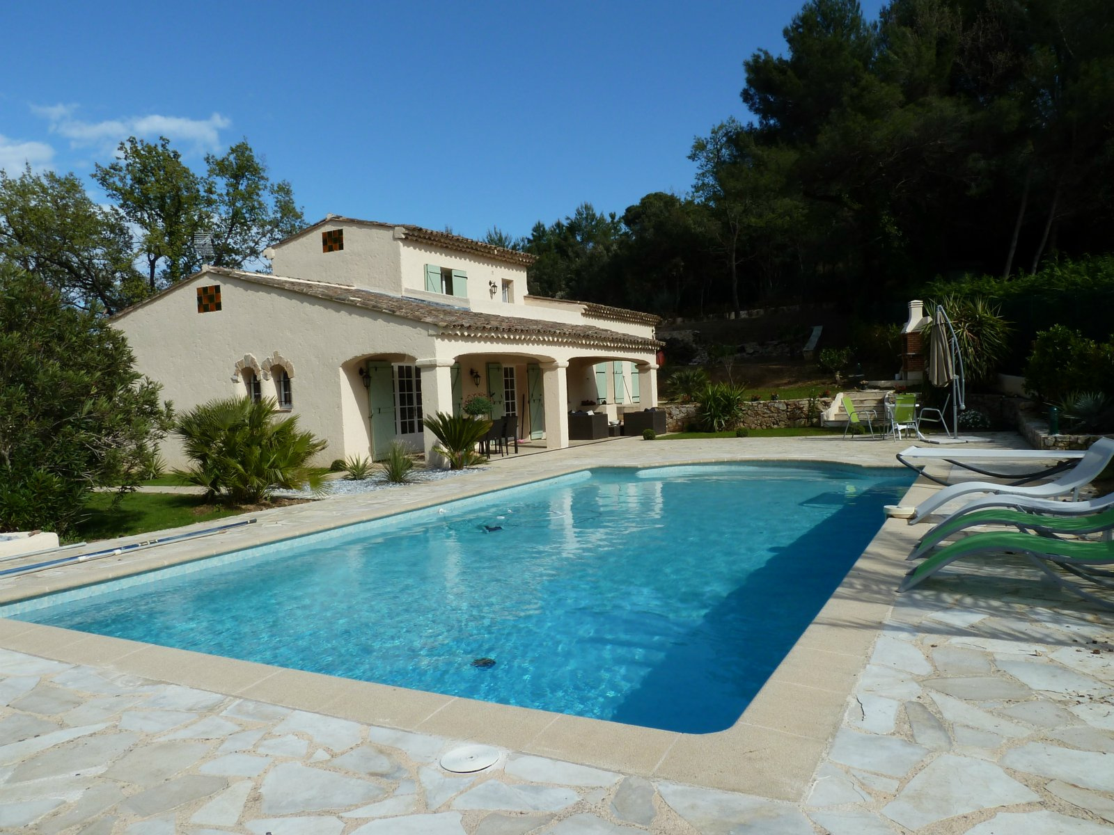 Spacieuse villa de 210 m² de 4 chambres avec un jardin plat complanté de 2700 m², piscine, parkings, cuisine américaine équipée, au calme absolu dans un secteur résidentiel sur les hauteurs du Cannet. Pour 8 personnes.