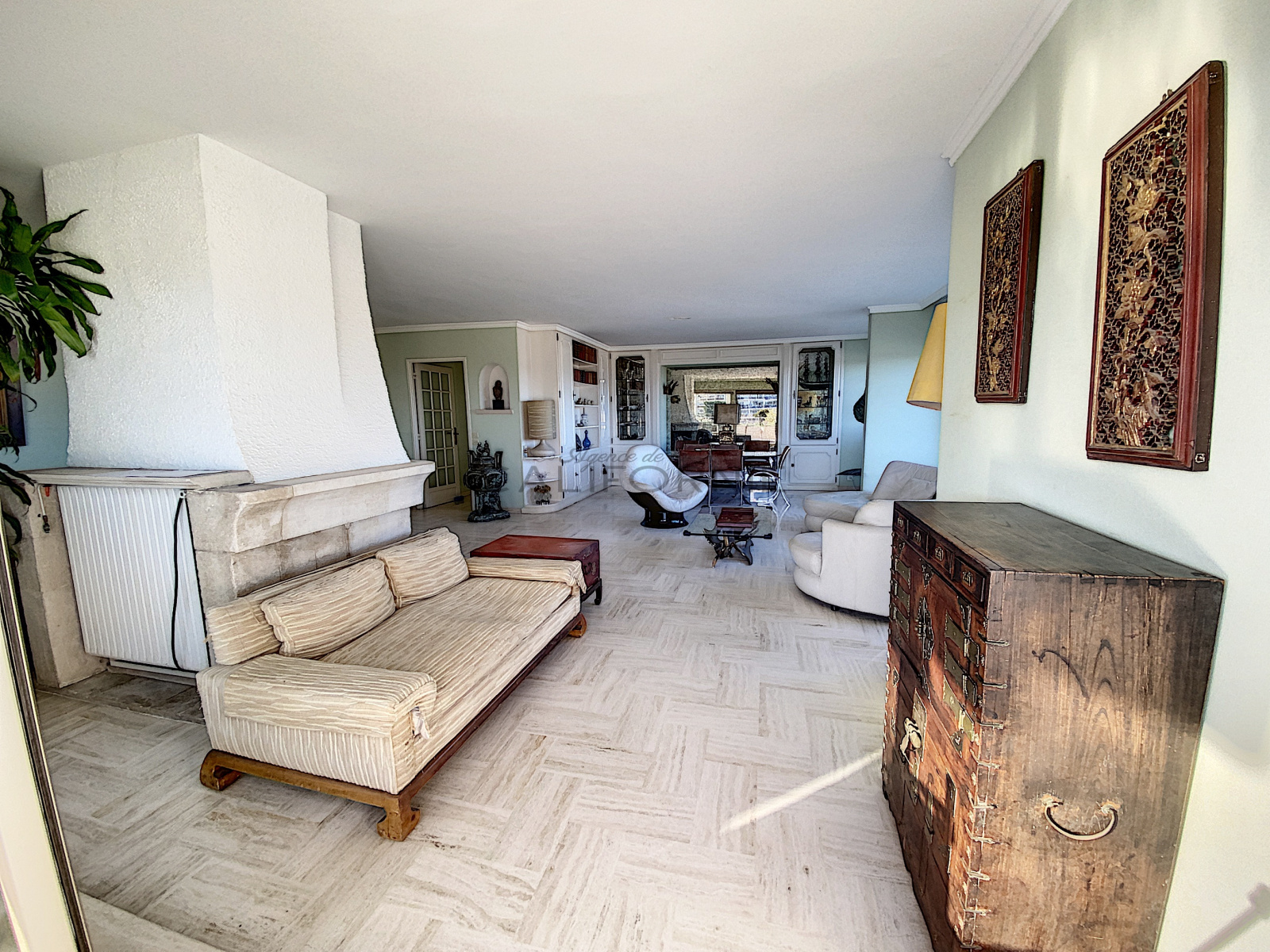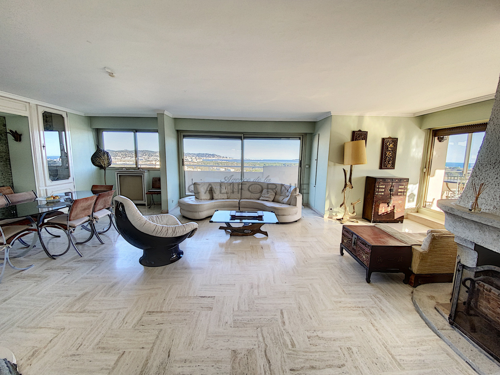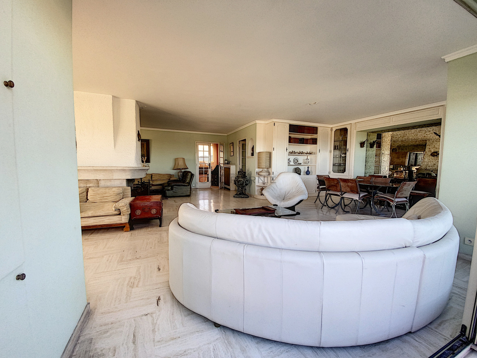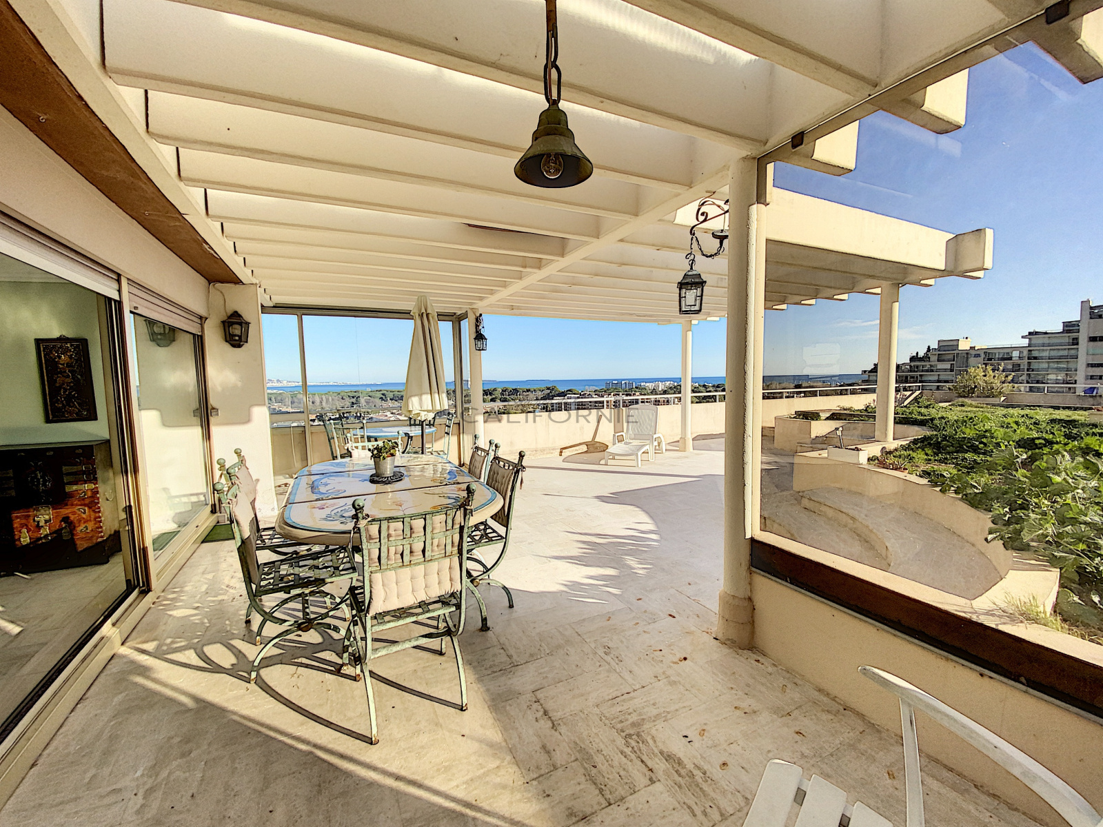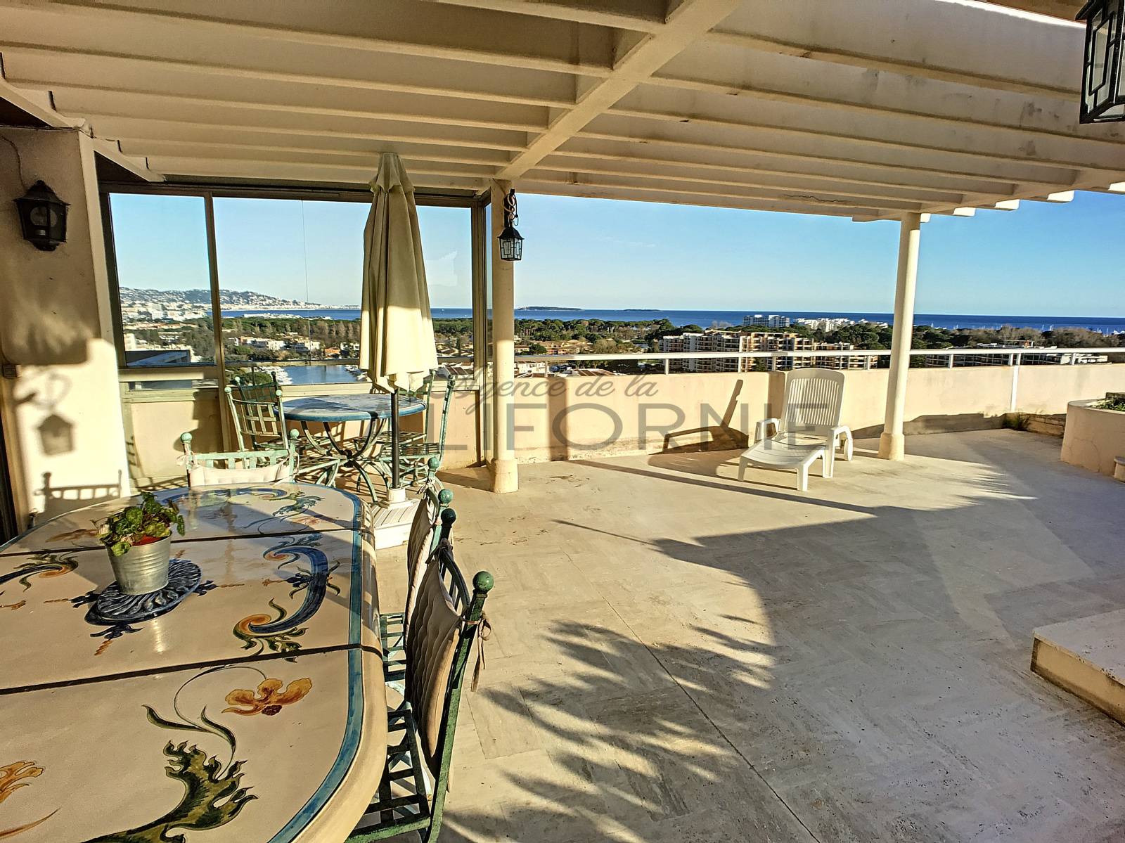 Mandelieu-la-Napoule (06210)VENDU Spacieuse villa sur le toit de 153,22 m² L.C. profitant d'une terrasse de 269 m² prolongée d'une très jolie vue mer sur toute la baie de Cannes et sur l'Esterel. Double séjour de 60 m² jouissant d'une cheminée, cuisine séparée, 3 chambres avec salle de douche et WC, buanderie, deux cave et un box fermé en sous sol. Résidence gardiennée profitant d'une piscine situé au pied du port Cannes Marina, toutes les commodités situé aux pieds de la résidence. Possibilité d'un anneau de port pour le bateau en sus.